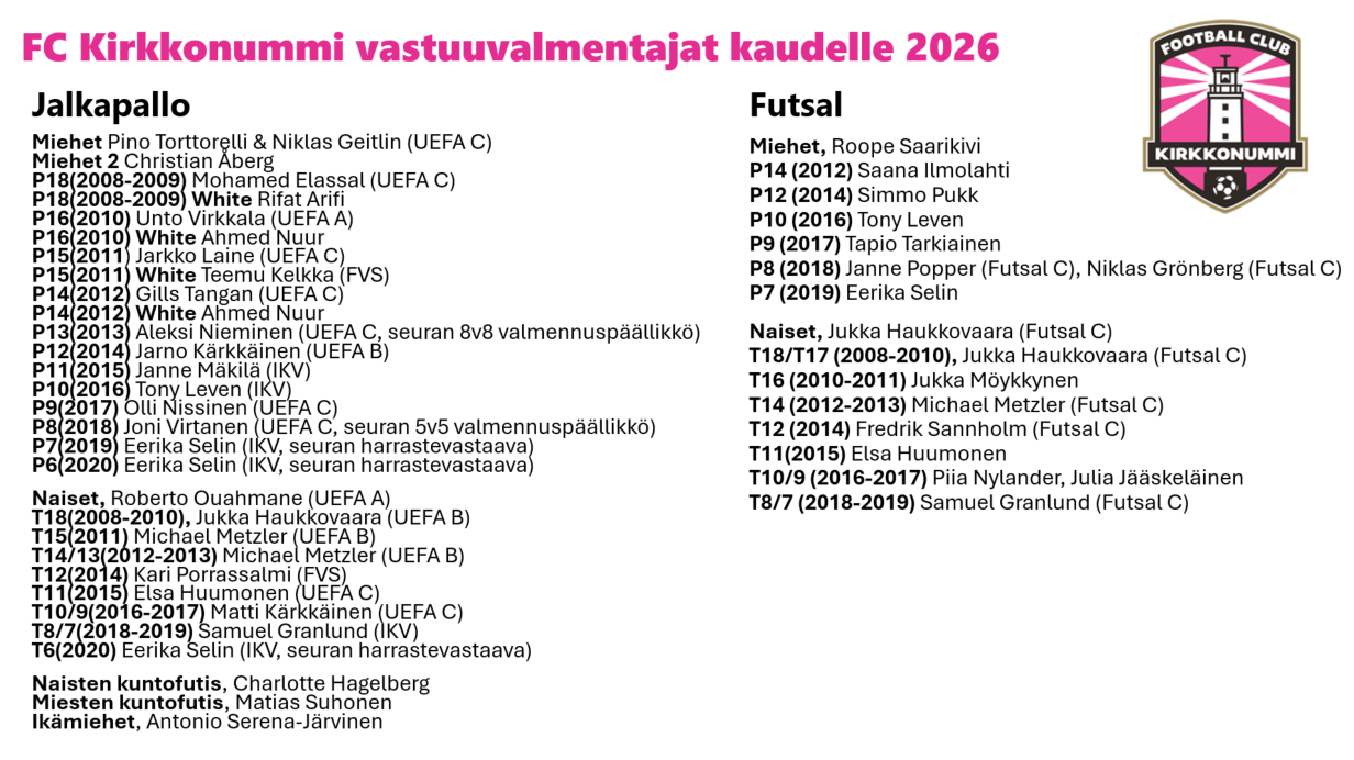 FC Kirkkonummi julkaisee vuoden 2026 jalkapallo- ja futsal-kauden vastuuvalmentajat.  Olemme iloisia sekä jatkavien valmentajien pysyvyydestä että uusien osaajien mukaantulosta. Seura on panostanut rekrytointiprosessiin huolellisesti ja valinnat on tehty pelaajakehityksen, osaamisen ja seuran arvojen pohjalta. Olemme myös halunneet seurana jälleen olla ajoissa liikkeellä sopimusten kanssa, jotta saamme sujuvan siirtymän uuteen kauteen.